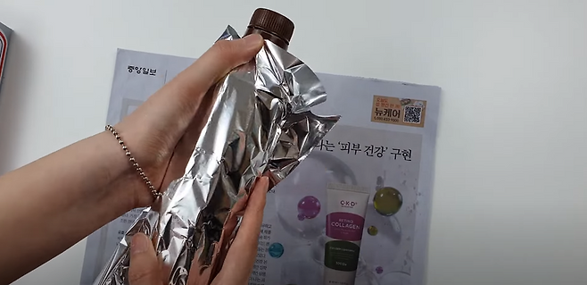 이렇게 쿠킹호일로 깔때기를 만들면 형태를 바꾸기가 쉬워 병입구에 맞게 크기를 바로바로 조절할 수 있어서 좋아요. 또, 일반 깔때기를 이용해서 기름을 옮기다 보면 입구가 작은 깔때기를 꼼꼼히 씻는데 여간 번거로운 게 아니죠?. 그런데 만들어서 쓰니까 씻을 필요 없이 바로 버릴 수 있어 간편해요.
