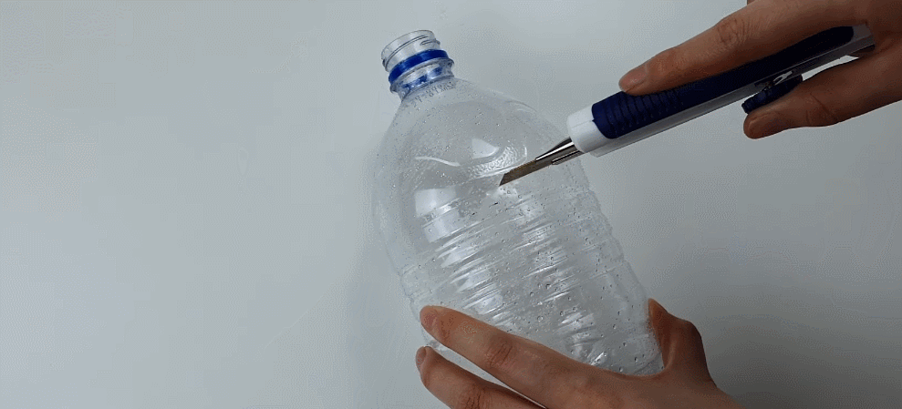 그리고 페트병의 윗 부분을 필요한 크기로 잘라주세요. 이때 칼집을 먼저 넣어주고 가위를 이용해서 자르면 편리해요. 칼집을 낼 때는 다치지 않도록 조심조심... 이번에는 자르는 단 한 단계만으로 깔때기가 완성됐어요.