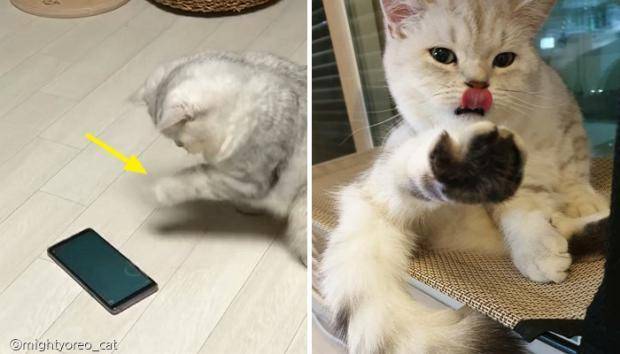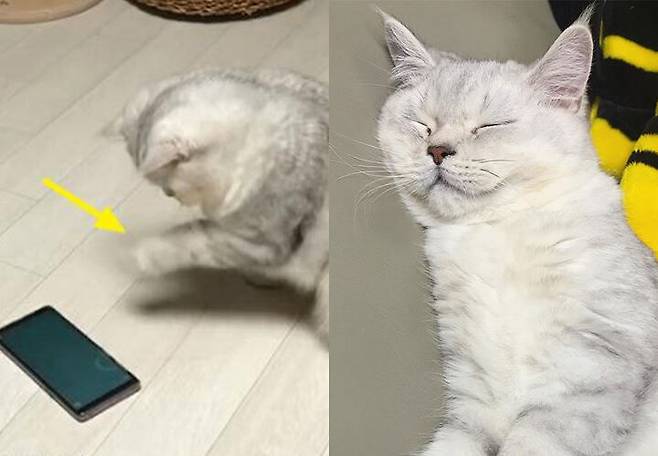 냥젤리를 이용해 스마트폰 속 거미를 잡을 수 있는 어플리케이션을 좋아한다는 고양이 '레오'