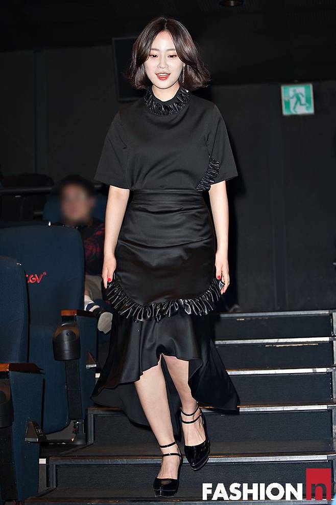 허영지는 올 블랙 투피스 패션으로 시선을 사로잡았다. 독특한 프릴 디테일이 더해진 블라우스와 언발 스커트에 블랙 스트랩 힐을 착용했으며 레드 립으로 포인트를 주어 상큼 발랄한 매력을 발산했다.