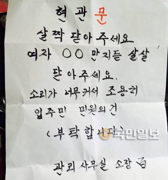 9일 한 온라인 커뮤니티에는 여성들이 주로 사는 오피스텔 현관문에 붙은 안내문 하나가 올라왔습니다. 관리사무실 소장이 작성한 것으로 보이는 안내문에는 “여자 OO를 만지 듯 (현관문을) 살살 닫아주세요”라며 “소리가 너무 큽니다”라는 문구가 적혀 있는데요. 현관문이 고장이 났는지 문이 세게 닫히며 시끄럽다는 민원이 잇따르자 작성한 것입니다.