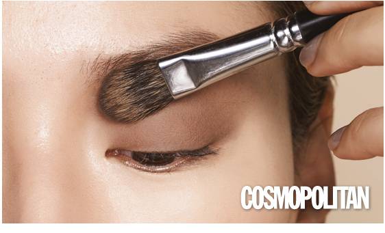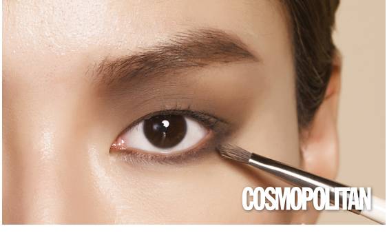 2. 넓은 아이섀도 브러시로(물론 손가락을 사용해도 된다) 눈썹 밑과 눈 앞머리 쪽에 섀도를 덧바른다. 콧대 옆까지 자연스럽게 블렌딩하면 코가 오뚝해 보이는 효과가 있다.