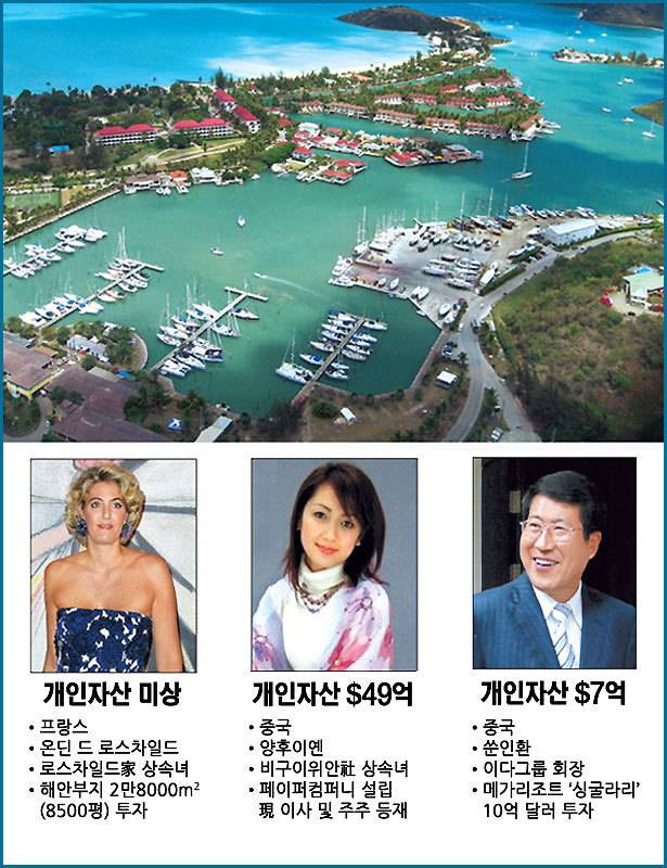 이 뿐 아니다. 한 중국 부자는 앤티가바부다 투자에 불씨를 당겼다. 상ㆍ공업 용지 개발 등에 주력하는 부동산기업 이다(億達)그룹 창업자 쑨인환(孫蔭環ㆍ66)이다. 2013년 기준 순자산 6억6500만달러를 보유한 그는 2013년부터 이곳서 리조트 개발 프로젝트에 착수했다. ‘싱굴라리(Singulari)’란 이름의 이 시설은 연면적 6.5㎢로 서울 여의도 (2.9㎢ㆍ제방 안쪽 기준)의 2.2배다. 쑨 창업자는 카리브지역 최대 카지노가 들어가는 이 리조트에 10억달러를 쏟아부었다. 자신의 전 재산보다 덩치가 큰 사업인 셈이다.
