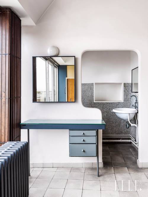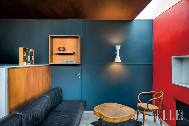 앞에 보이는 암체어 ‘그랑 콩포르’는 르 코르뷔지에가 샤를로트 페리앙, 피에르 잔느레와 함께 디자인했다. 암체어 위의 벽에 달린 조명은 원래 마르세유의 유니테 다비타시옹(l’Unite d’Habitation; 집합 주택)을 위해 디자인한 제품이다.