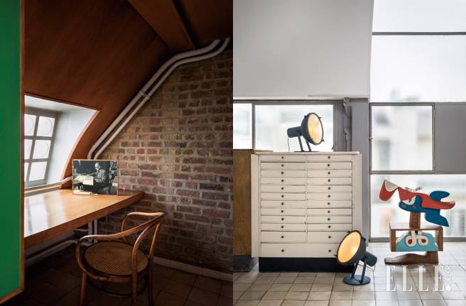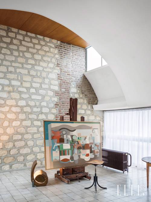 천장이 둥근 르 코르뷔지에의 아틀리에. 그는 돌과 벽돌이 그대로 노출된 아틀리에의 벽 앞에서 사진 찍히기를 좋아했다. 조각 작품처럼 보이는 황동 조명 에스카르고(Escargot)는 리미티드 에디션으로 Nemo Lighting. 이젤 위에 있는 ‘여러 개의 사물이 있는 정물화(Nature morte aux nombreux objets)’는 르 코르뷔지에가 1923년 그린 그림으로 ‘Jeanneret’라는 사인이 적혀 있다(그가 르 코르뷔지에라는 이름을 쓰기 전이다).