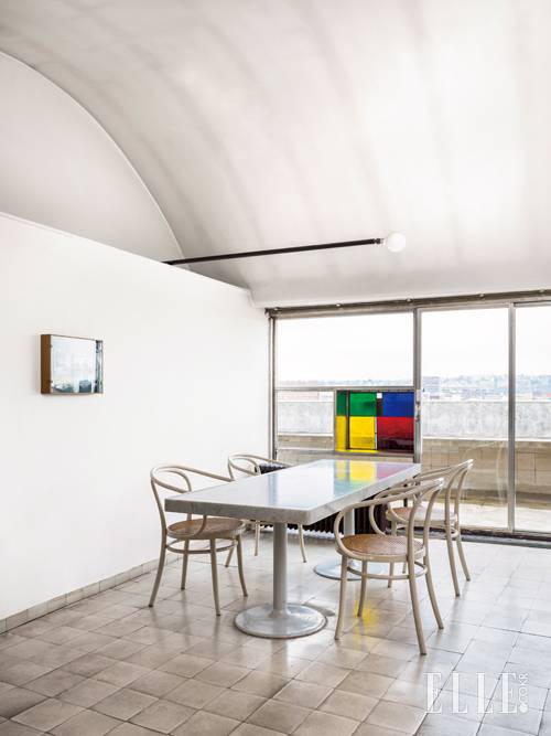 다이닝 룸. 영안실 테이블에서 영감을 얻어 디자인한 대리석 테이블에는 르 코르뷔지에가 정말 좋아했던 토넷의 No.9 암체어를 놓았다. 통창 가운데에 여러 가지 컬러의 유리를 그림처럼 삽입했다.