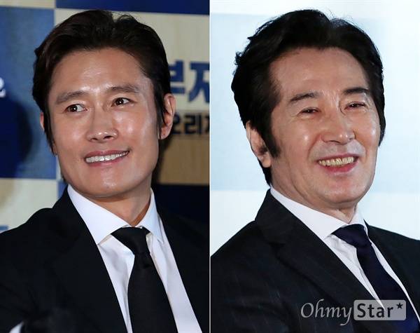 | ▲ 23일 오후 서울 왕십리CGV에서 열린 영화 <내부자들 : 디 오리지널> 시사회에서 정치깡패 안상구 역의 배우 이병헌과 유명 논설주간 이강희 역의 배우 백윤식이 동료배우의 이야기를 들으며 웃고 있다. |