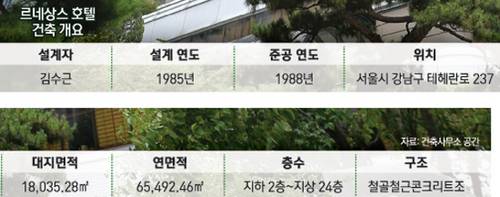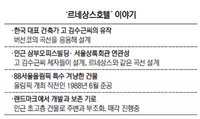 르네상스호텔은 한국을 대표하는 건축가 고 김수근씨의 유작이다. 지난 1988년 완공된 이 호텔은 세상을 떠나기 1년 전인 1985년 병상에서 스케치한 마지막 작품 중 하나다. 비슷한 시기에 설계한 서울역 인근의 '벽산빌딩(현 게이트웨이타워)'도 르네상스호텔처럼 모서리가 곡선인 것이 특징이다. 이는 그 시기 김수근씨의 작품세계를 이해할 수 있는 작은 단서가 된다.