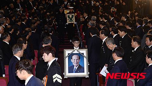 【서울=뉴시스】전신 기자 = 故 이만섭 前 국회의장 국회장 영결식이 18일 오전 서울 여의도 국회 의원회관 대강당에서 엄수되고 있다. 2015.12.18.