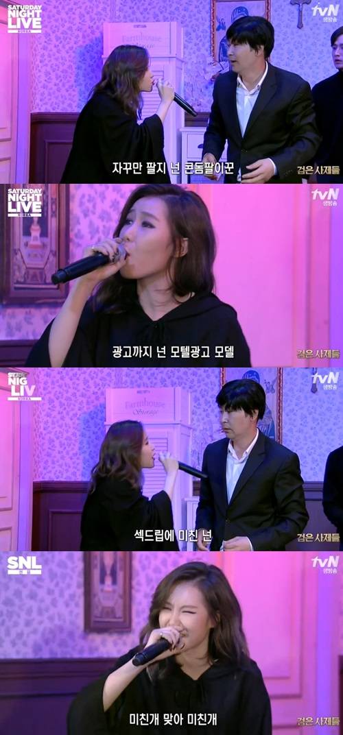 그의 품에서 빠져나온 예지는 짜증스러운 얼굴로 랩을 시작했다. "콘돔팔이꾼" "광고까지 넌 모텔광고모델" "섹드립에 미친 넌" 등의 직설적인 가사로 랩을 선보였다. (사진=tvN ‘SNL 코리아 시즌6’ 방송 캡처)