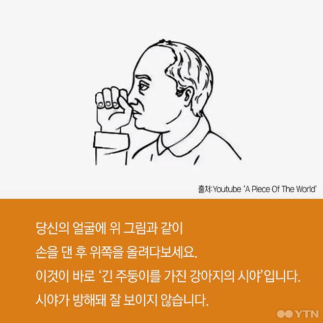 당신의 얼굴에 위 그림과 같이 손을 댄 후 위쪽을 올려다보세요. 이것이 바로 ‘긴 주둥이를 가진 강아지의 시야’입니다. 시야가 방해돼 잘 보이지 않습니다.
