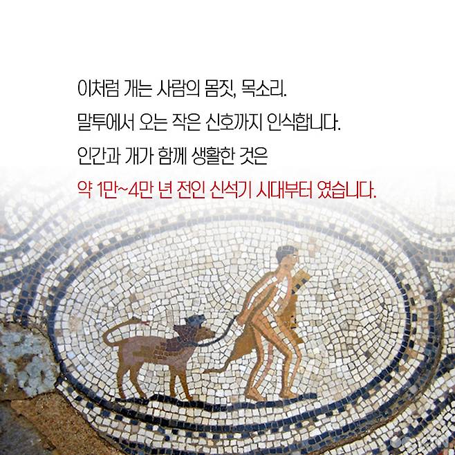 이처럼 개는 사람의 몸짓, 목소리, 말투에서 오는 작은 신호까지 인식합니다. 인간과 개가 함께 생활한 것은 약 1만~4만 년 전인 신석기 시대부터 였습니다.