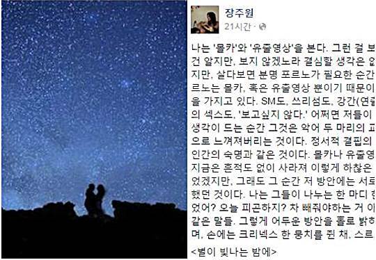 장주원은 28일 자신의 페이스북에 “나는 몰카와 유출영상을 본다. 그런 걸 보는 게 별로 아름다운 일이 아니라는 건 알지만 보지 않겠노라 결심할 생각은 없다”며 장문의 글을 남겼다.