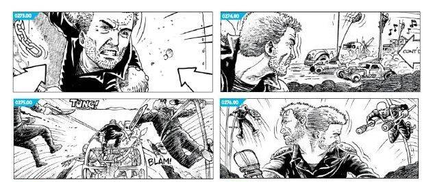 ‘매드맥스4’는 최소한의 대화와 최대한의 영상으로 채워진 그래픽 노블 같은 영화다. 촬영도 글로 쓰인 시나리오가 아닌 그림 위주의 300쪽짜리 스토리보드를 토대로 이뤄졌다. 설명적인 대사가 거의 없는 건 ‘세계 어디서나 자막 없이도 이해할 수 있을 만한 영화를 만들어야 한다’는 밀러 감독의 생각이 반영된 것이다. 대사가 많지 않고 추격전의 영상을 설명하는 것이 중요했기 때문에 시나리오보다 스토리보드가 훨씬 유용했고 밀러 감독은 다섯 명의 아티스트를 고용해 3,500개에 달하는 컷을 그리도록 했다. 감독은 이렇게 말했다. “스토리보드가 있으면 연출 방향이나 카메라 움직임을 따로 적을 필요가 없어요. 배우들도 스토리보드를 보고 연기하니까 언제 어디서 어떻게 움직일지 알고 있죠. 굉장히 유용했습니다.”