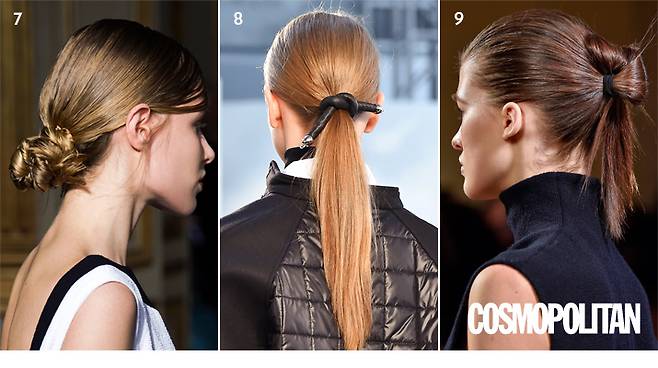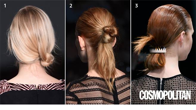 1.JEAN-PIERRE BRAGANZA 손가락으로 슥슥 빗어 질끈 묶을 거라면 그냥 포니테일 말고 약간의 꼬임디테일을 넣어보면 어떨까? 러프하게 머리 끝만 땋아 내린 뒤 돌돌말아 사이드에서 고정하면 완성된다. 2.EMILIO DE LA MORENA 오버핏 코트에 매치해보길 추천! 뒤통수 중간에서 머리를 묶어 고정한다. 그 다음 묶은 머리를 반만 땋아 번을 만들고 나머지는 아래로 빼서 마무리. 3.SUNO 볼드한 핀을 활용해보는 것도 좋은 방법. 목덜미에서 고정한 로우 포니테일을 완성한 뒤 그 뒤로 뒤집듯 반으로 접어 핀으로 고정하면 간단하게 완성.