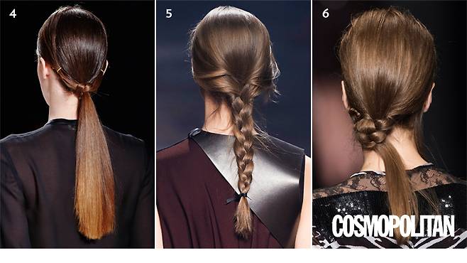4.ERIN FETHERSTON 손기술이 좋다면 조금 기하학적인 포니테일에 도전해보는 것도 굿. 양옆머리를 뒤로 넘겨 소시지 머리를 연출하고 목덜미에서 다시 나머지 머리와 묶어 고정하자. 컬러 머리끈으로 포인트를 더해도 좋다. 5.LANVIN 잔머리 휘날리는 여성스러운 브레이드 헤어를 보고 반하지 않을 남자 누가 있으랴. 손가락으로 슥슥 빗어가며 대충 땋아 내렸을 뿐이라고 전해라~~ 6.JOHN RICHMOND JEAN-PIERRE BRAGANZA 모델의 뒷모습과 연출 방법은 비슷하나 그보다 좀더 촘촘히 땋은 뒤 끝머리는 땋지 않은 채 빼서 내리는 게 핵심!