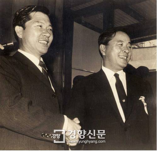 | 1970년 9월 신민당 전당대회에서 김영삼 후보를 누르고 대통령 후보로 당선된후 악수하고 있는 김대중 후보 /경향신문 자료사진 |