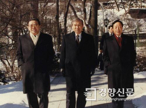 | 1990년 1월 노태우 대통령(가운데)과 두 김 총재(왼쪽은 김종필 신민주 공화당, 오른쪽은 김영삼 통일 민주당 총재)가 3당 합당 회담을 가졌다. /경향신문 자료사진 |