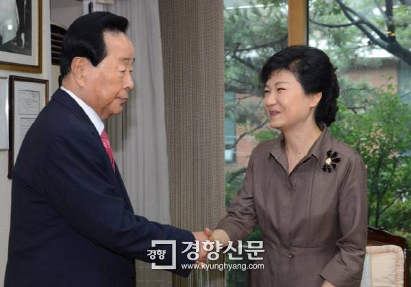 | 2012년 8월22일 박근혜 당시 새누리당 대선후보가 서울 동작구 상도동 김영삼 전 대통령을 예방하고 이야기를 나누고 있다. /박민규 기자 parkyu@kyunghyang.com |