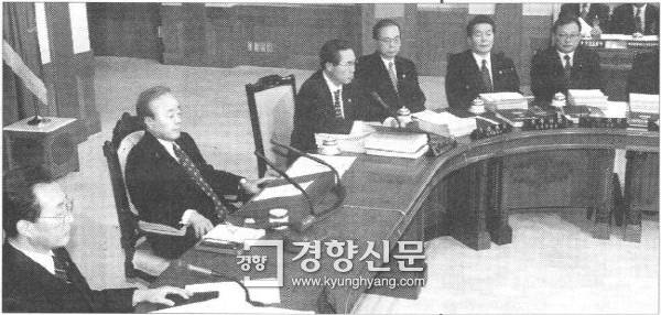 | 1997년 12월2일 김영삼 대통령과 국무위원들이 청와대 임시국무회의에서 임창열 경제부총리(왼쪽 세번째)의 IMF협상 관련 보고를침통한 표정으로 듣고 있다. /경향신문 자료사진 |