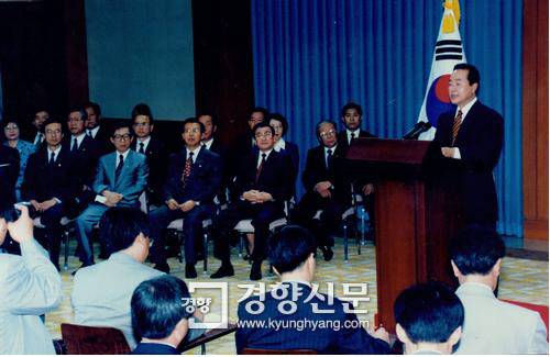 | 1993년 8월 청와대에서 금융실명제 실시를 발표하고 있는 김영삼 대통령 /경향신문 자료사진 |