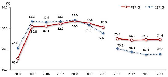 통계청이 2일 발표한 ‘통계로 보는 여성의 삶’ 보고서에 따르면, 2014년 여학생의 대학진학률은 74.6%로 남학생(67.6%)보다 높았다. 대학진학률은 2009년 여학생의 진학률이 남학생을 앞지른 후 남녀 학생 간의 격차가 점차 벌어졌다.