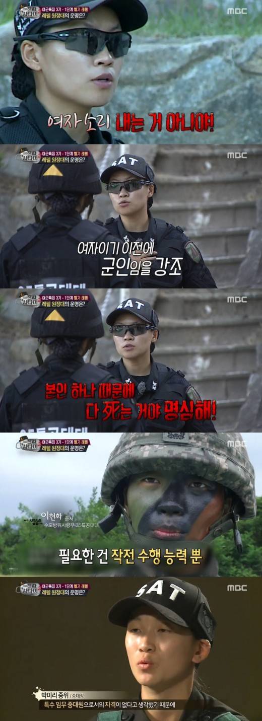 박미리 중위는 "여자 할거면 나가"라고 소리쳐 분위기를 싸늘하게 만들었다. 그는 훈련을 마친 후 제작진에 "여군은 약하다는 소리를 듣고 싶지 않다. 그래서 여자로서의 평소 습관을 버리는 것이 중요하다"며 바짝 군기를 잡는 모습을 보였다.