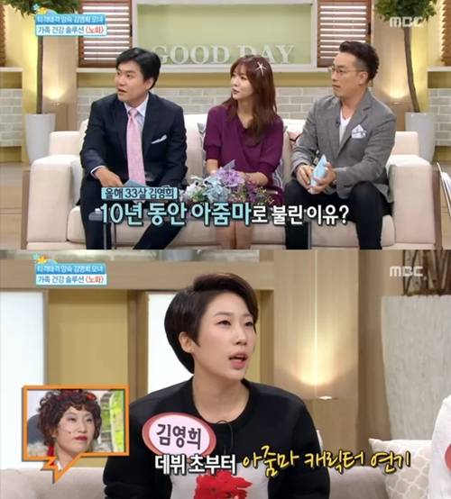 개그우먼 김영희는 "올해 서른셋인데 10년동안 아줌마라 불린 이유가 뭐냐"는 MC들의 질문에 "그동안 아줌마 역할을 많이 했다"며 "그나마 젊은 역할을 한 게 쫄쫄이를 입고 헬맷을 쓴 거여서 그마저도 연령이 불분명했다"고 말했다.
