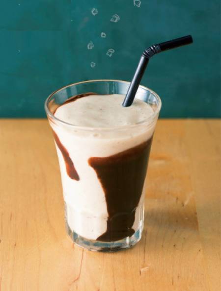 2. 잔 안쪽에 초콜릿 시럽을 뿌리고 갈아낸 재료를 담는다.