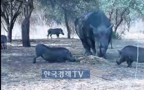 [핫영상] 코뿔소 먹이 뺏어먹다 봉변당한 멧돼지