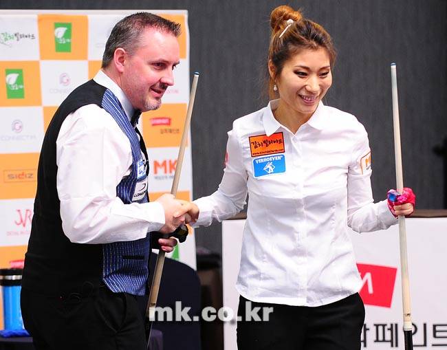 결승을 앞두고 프레드릭 쿠드롱 선수, 부인 제시카 쿠드롱 선수 팀과 김재근 선수, 김보미 선수 팀이 이벤트 경기에서 승부를 겨루고 있다.