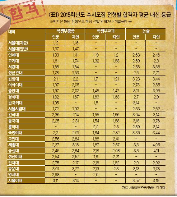 지난해 입시 결과를 살펴보는 것도 도움이 된다. 2015학년도 기준으로 대학교에서 발표한 내신 합격 평균 등급을 살펴보면 서울대 지역균형선발전형 인문계열은 1.12등급, 자연계열은 1.16등급, 일반전형 인문계열은 1.37등급, 자연계열은 1.47등급이었다. 고려대 인문계열을 기준으로 살펴보면 학생부교과전형은 1.32등급, 학생부종합전형은 1.61등급, 논술전형은 2.69등급이었다. 대체로 학생부교과보다는 학생부종합이, 학생부종합보다는 논술전형이 낮은 편이다. <표1 참조>