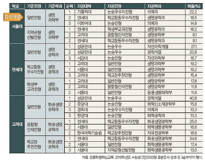 나와 비슷한 수준의 학생들이 어떻게 지원하는지 파악하는 것도 필요하다. 종로학원하늘교육이 지난해 수시 지원자 16만 명을 표본 조사한 결과 6회 지원 대부분 학과와 전형을 비슷하게 지원하는 경우가 많았다. 서울대 경영학과 일반전형에 지원한 학생 중에는 연세대 경영학과에 학교활동우수자전형으로 지원한 비율이 23.3%, 연세대 경영학과에 학생부교과전형으로 지원한 사람이 13.3%, 서강대 경영학과에 자기주도전형으로 지원한 사람이 10%, 성균관대 글로벌경영학과에 성균인재전형으로 지원한 사람이 6.7%순으로 나타났다. <표2 참조>