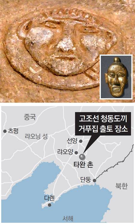 | 묘하게 닮은 고조선-부여 시대 얼굴중국 랴오닝 성 랴오양 박물관에 전시돼 있는 청동도끼 거푸집의 고조선인 얼굴. 기원전 5, 6세기에 제작돼 현존하는 가장 오래된 한민족의 얼굴로 보인다. 상투를 틀기 위해 머리를 묶어 올린 것이 부여 금동 가면(위쪽 작은 사진)에서도 발견된다. 이종수 단국대 교수 제공 |