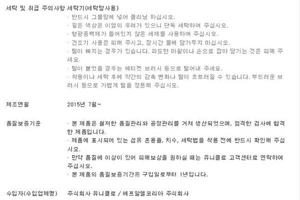 문제는 구매 당시 이 같은 사실을 모르고 구매할 수밖에 없었다는 점이다. 사실 유니클로 홈페이지 내 해당제품 상세 설명 페이지에는 세탁 및 취급 주의사항에서 “털이 빠지는 경우가 있습니다. 과도한 마찰이나 손으로 잡아당기는 것은 피해 주세요”라고 표시하고 있다. 그런데 이 문구는 타 브랜드 제품에서도 볼 수 있는 일반적인 주의사항 표시다. 차이점은 타 브랜드 제품에서는 이같은 주의사항 표시와 달리 털이 빠지지 않는 반면 문제의 제품은 과도한 마찰이나 손으로 잡아 당기지 않아도 털이 빠진다는 점이다. 또한 이 문구는 온라인을 통해 구매하는 소비자만 볼 수 있다. 따라서 이 같은 주의사항을 오프라인 매장 상품에도 표시해 소비자가 올바른 구매를 할 수 있게 해야 함에도 이 브랜드는 기본사항 조차 지키고 있지 않았다.