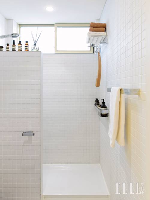 샤워 설비는 Hansa. 욕실 용품은 Aesop. 목욕 타월과 브러시는 Jaju.