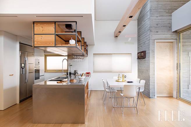 아일랜드 키친은 스테인리스스틸 소재, 레스토랑 키친에서 영감을 얻었다. 싱크대 수도는 Grohe. 다이닝 테이블은 안토니오 치테리오가 디자인한 ‘익스텐더블 다이닝 테이블’로 Vitra. 다이닝 체어는 재스퍼 모리슨이 디자인한 ‘할’ 컬렉션으로 Vitra. 테이블의 트레이와 저그와 촛대는 Tom Dixon. 접시들은 서울의 도예가 오정실 작품. 다이닝 테이블의 모빌은 도쿄에서 사온 것. 오른쪽의 도어는 아내의 작은 오피스 공간으로 이어진다.