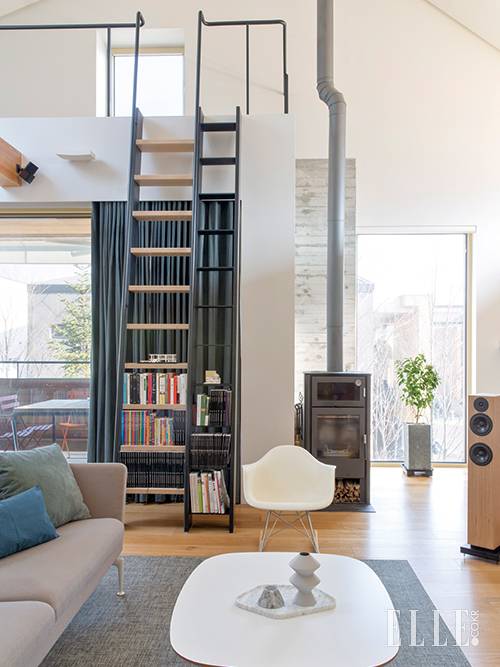 사다리는 페인팅 스틸 소재. 구조적으로 메자닌을 만들고 싶었을 뿐 특별한 용도는 없다는 사다리에 걸터앉은 조수용.