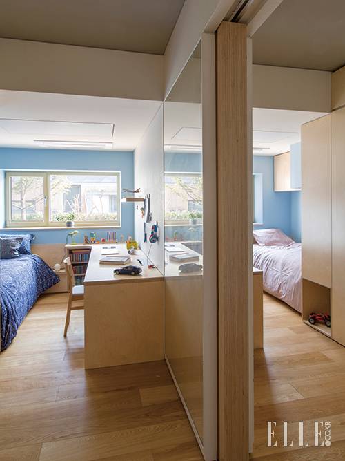 형제의 침실은 서로 마주보았을 때 똑같은 구조를 취한다. 문 없이 슬라이딩 파티션으로 방을 분리했고 벽면을 거대한 보드로 활용한다. 데스크 체어는 Muji. 베드 리넨은 Kittybunnyponny.