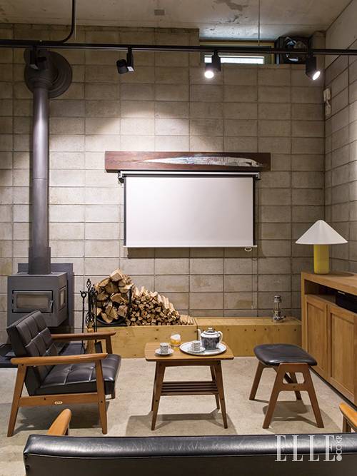 친구들과 엔터테인먼트를 즐기는 남자들의 작업실 같은 공간. 소파와 암체어는 ‘K’ 컬렉션, 스툴은 ‘스태킹 스툴’, Karimoku 60. 테이블은 세덱에서 구입했다. 옐로 테이블 램프는 할게이르 홈스트베 (Hallgeir Homstvedt)가 디자인한 ‘톱(Topp)’ 모델로 Established and Sons.
