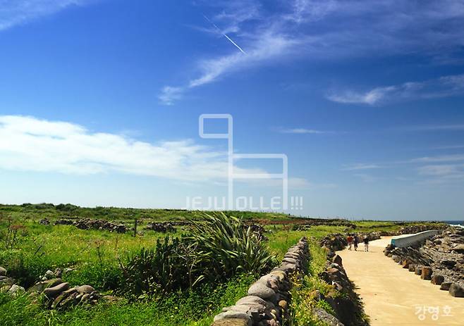 제주시 조천 만세동산에서 시작해 신흥, 함덕, 북촌, 동복을 거쳐 김녕까지 이어지는 제주올레 19코스는 바다와 오름, 곶자왈, 마을, 밭 등 제주의 가장 아름다운 모습들을 지루할 틈 없이 펼쳐 보여준다. 밭에서 물빛 고운 바다로, 바다에서 솔향 가득한 숲으로, 숲에서 정겨운 마을로 이어지는 길의 전환은 너무 빠르지도 너무 늦지도 않다. 딱 적당한 시점에 적당한 풍경이 마치 무대 뒤에서 완벽한 분장을 한 채 대기하고 있던 배우처럼 등장하며 길의 드라마를 펼쳐나간다.