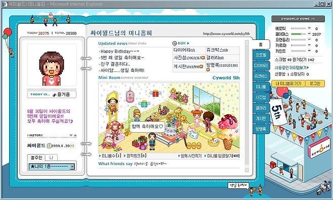 1999년 설립돼 2004년부터 시작된 ‘싸이월드’ 붐은 2000년대 후반까지 계속됐다. ‘싸이월드’에서 개당 1백원에 판매되는 사이버 머니 ‘도토리’의 하루 판매량은 평균 1억 3천여만 원에 이르고 2008년에는 한 해 ‘도토리’ 판매액만 800억 원을 넘겼다. ‘싸이질(싸이월드에서 미니홈피를 꾸미는 일)’이나, 싸이질에 열중하는 이들을 가리키는 ‘싸이홀릭’, ‘싸이폐인’과 같은 신조어가 등장할 정도로 인기를 끌었다. 개인 홈피지만 파급력이 높았기에 스타에서 정치인까지 미니홈피 관리는 필수가 됐다. 투데이 멤버에 뽑히면 자신의 홈페이지가 싸이월드 메인에 광고되면서 방문자수가 급격히 늘어나는 것에 사람들은 좋아했고, 광장에서는 베스트 리플 일명 ‘베플’에 서로 뽑히려고 다양한 리플을 적어놓은 것을 쉽게 볼 수 있었다.