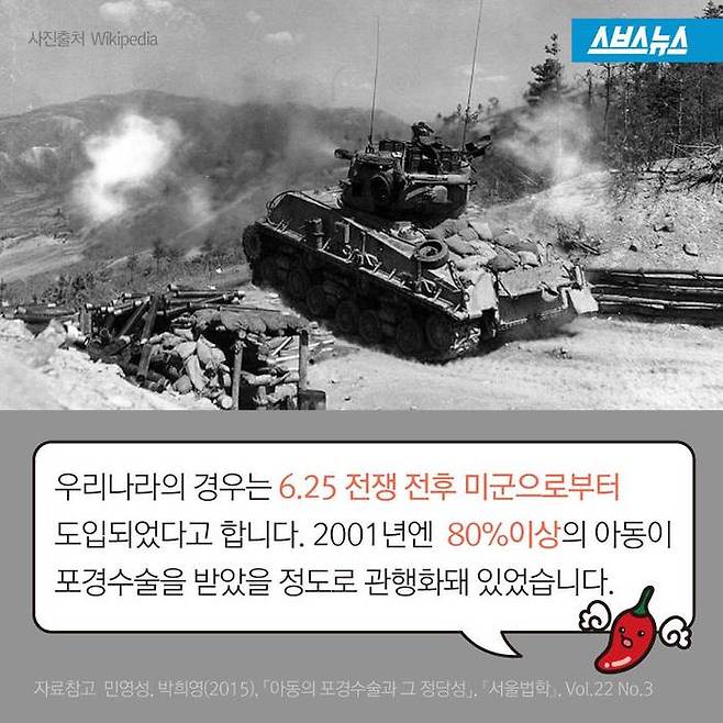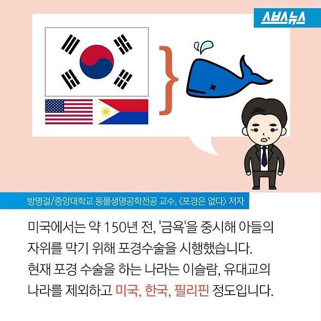 "미국에서는 약 150년 전, '금욕'을 중시해 아들의 자위를 막기 위해 포경수술을 시행했습니다. 현재 포경 수술을 하는 나라는 이슬람, 유대교의 나라를 제외하고 미국, 한국, 필리핀 정도입니다." (방명걸/중앙대학교 동물생명공학전공 교수, <포경은 없다> 저자)