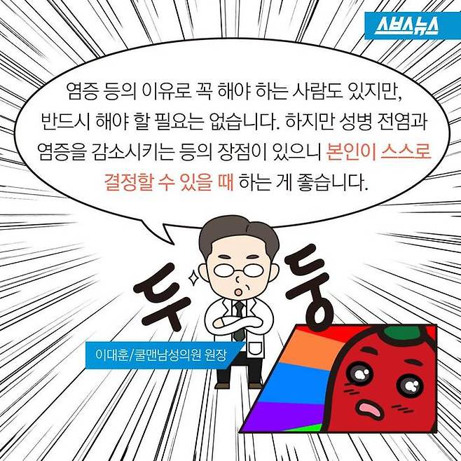 "염증 등의 이유로 꼭 해야 하는 사람도 있지만, 반드시 해야 할 필요는 없습니다. 하지만 성병 전염과 염증을 감소시키는 등의 장점이 있으니 본인이 스스로 결정할 수 있을 때 하는 게 좋습니다." (이대훈/쿨맨남성의 원 원장)