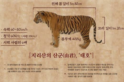 몸무게 400kg, 전체 몸길이 3m 80cm에 육박하는 거대한 조선 호랑이는 일제의 해수구제정책으로 한반도에서 자취를 감췄다. 해수구제정책이란, 일제강점기에 일본 총독부에서 조선인의 생명과 재산을 앗아가는 해로운 짐승이라는 명목 하에 조선범 사냥대 정호대를 조직하여 무분별하게 호랑이를 사냥한 일제의 계획 사업이었다.