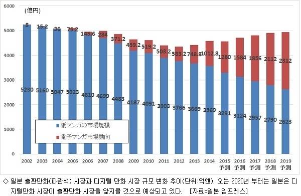 일본 출판만화 시장은 3천569억엔(3조5천100억원) 규모로 여전히 큰 시장이지만 최근 10년간 추이를 보면 매년 4~6%씩 감소하고 있다. 현지 업계에서도 오는 2020년에는 디지털만화가 출판만화 시장을 추월할 것으로 내다보고 있다.