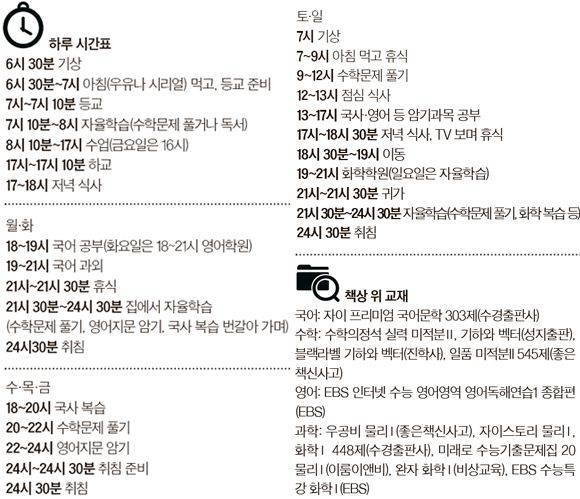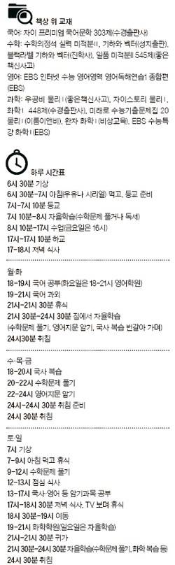 매일 계획을 세워 공부하는 것도 도움이 된다. 집에서 자율학습을 시작하기 전에 화이트보드에 그날 공부할 내용을 적는다. ‘오후 6~8시 한국사 복습’ ‘오후 8~9시 수학 문제 풀기’ ‘오후 9~11시 영어 지문 암기’와 같은 식이다. 그는 “화이트보드에 계획을 적어놓고 실행하다 보니 쉬는 시간에도 스스로 자제하게 됐다”며 “계획이 없으면 4~5시간 TV 보고 쉴 수 있지만 한국사 공부를 하다가 집중이 안 돼 잠깐 쉬어도 8시부터는 다시 책상 앞에 앉는다”고 말했다.