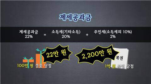 예를 들어 100만원 짜리를 경품으로 받았다고 한다면 22%인 22만원, 1억짜리 로또에 당첨됐으면 22%인 2200만원을 내야 하는 것이죠.