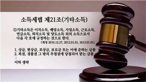 소득세법 제21조에 따르면 추첨에 당첨되어 받은 경품이 기타소득으로 인정된다는 사실을 알 수 있습니다.