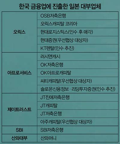 2010년 일본계 대부업체 오릭스가 첫 포문을 열었다. 푸른2저축은행을 인수한 데 이어 2013년에는 스마일저축은행의 경영권도 넘겨받았다. 지금은 OSB저축은행으로 간판을 바꿔 달았다. 제이트러스트는 2012년 미래저축은행을 인수했다. 이어 솔로몬저축은행, HK저축은행의 대출채권을 대규모로 사들여 덩치를 키웠다. 아프로서비스그룹은 예주·예나래저축은행을 인수해 OK저축은행으로 간판을 바꿔 달았다. 일본계 SBI·OSB·JT친애·OK·JT 5개 저축은행의 자산은 지난해 말 기준으로 7조4819억원. 전체 저축은행 자산의 19.8%를 기록했다. 특히 일본 SBI그룹이 옛 현대스위스저축은행을 인수해 이름을 바꾼 SBI저축은행은 자산 부분에서 압도적인 업계 1위를 달리고 있다. OK저축은행은 프로 배구단을 만들었는데 올 시즌 프로 배구 리그에서 우승했다. 창단 2년 만에 삼성화재·현대캐피탈·LIG손해보험 등을 꺾고 우승했다는 게 상징적이다.